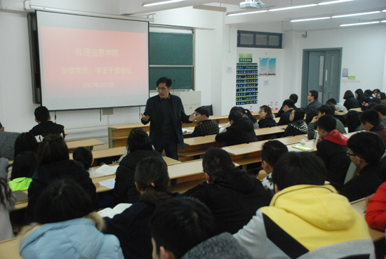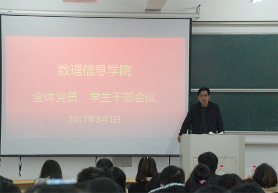 史正东老师向全体学生党员、学生干部传达了全省高校思想政治工作会议精神。要求在座全体党员、学生干部要深刻领会,认真学习、贯彻。随后,他向在座全体同学提出了两个问题:党员、学生干部是什么?为什么要做党员、学生干部?围绕这两个问题,史正东老师给在座同学进行了深刻分析。他指出学生干部是连接师生的桥梁,处于十分重要的位置,做学生干部也是一件无上光荣的、非常有意义的事情,不仅能在服务其他学生中实现自己的社会价值,而且还是锻炼自身能力的一个非常好的方式,身为学生党员干部要做好榜样,努力做好本职工作,在逼喱逼喱