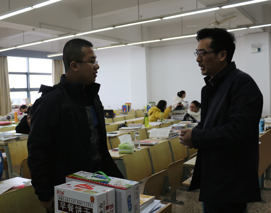 党委副书记史正东老师,学生科副科长邱科强老师和辅导员蔡寅亮老师来到考研教室,走访慰问了参加2016年考研的大四同学们。