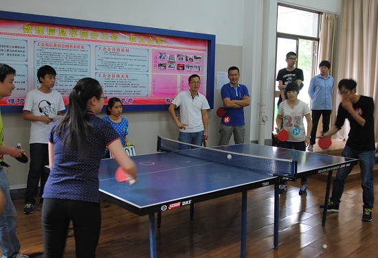 教工之家人头攒动,热闹非凡。22位教职工和22位同学在这里举行了一场别开生面的书院师生互动乒乓球赛。比赛采取师生男女混合双打形式,即每队一名男教师、一名女生或一名女教师、一名男生,胜方循环淘汰。