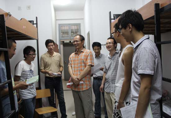 9月11日晚7点,2014级新生报到当晚,在院党委书记王建平教授的率领下,谢志堃副院长、盛宝怀副院长、史正东副书记、新生班班主任和全体辅导员老师等一行逐一走访了逼喱逼喱