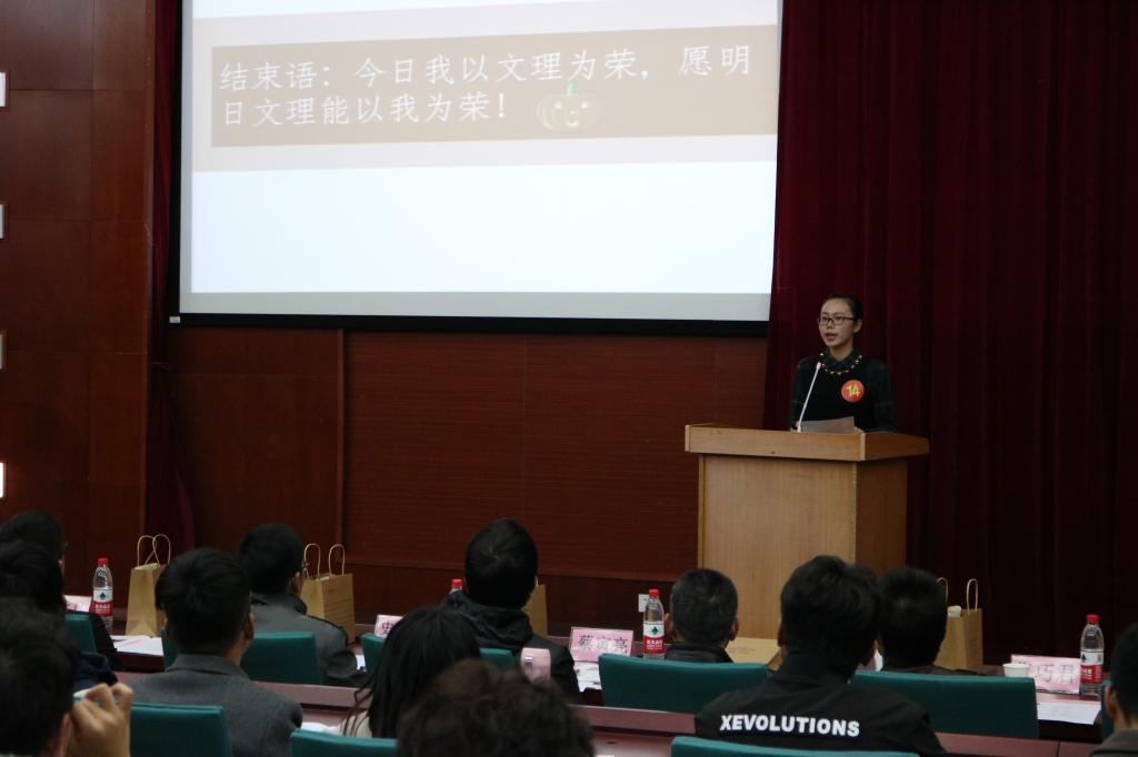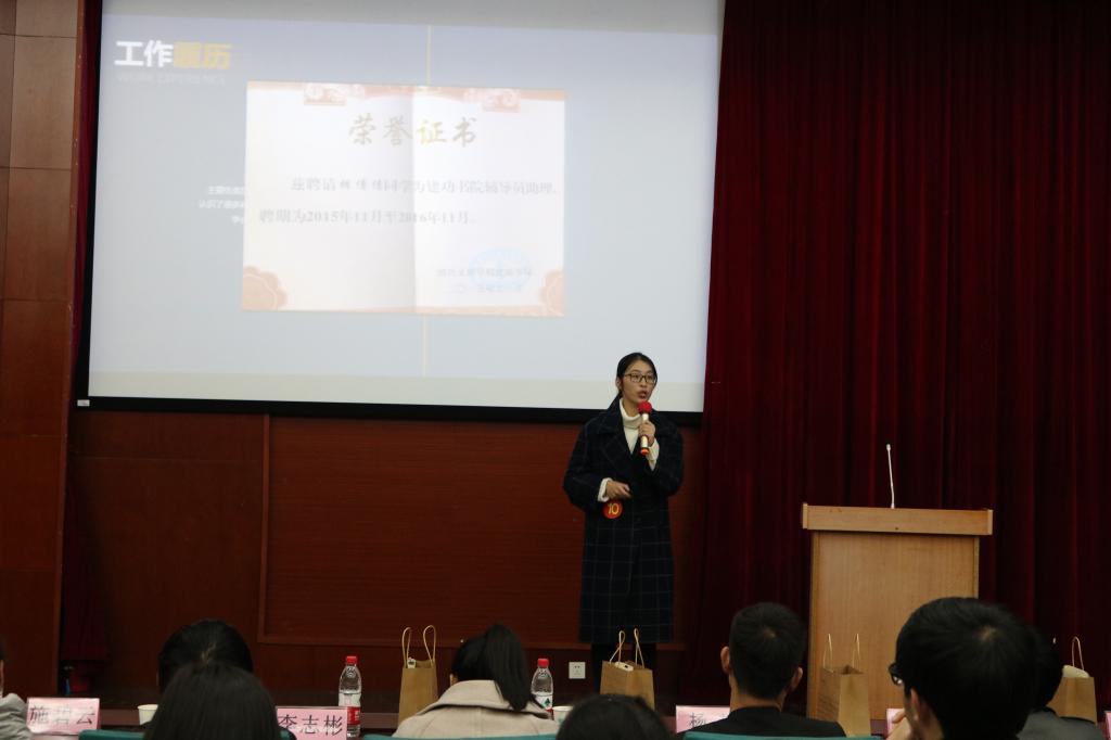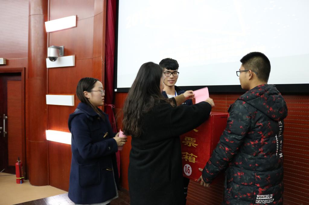 资格审查等程序,本次“十佳大学生”评选共有19位来自不同年级和专业的候选人参选。会议伊始,主持人进行简单的开场介绍,并明晰了此次评选会的评选办法和投票规则。接着由各位候选人按顺序依次上台进行风采展示,短短的四五分钟时间,他们用无畏的勇气和饱满的热情向在场所有师生证明:他们足够优秀。而各具特色的演讲风格也赢得老师们的认可和观众们热烈的掌声。