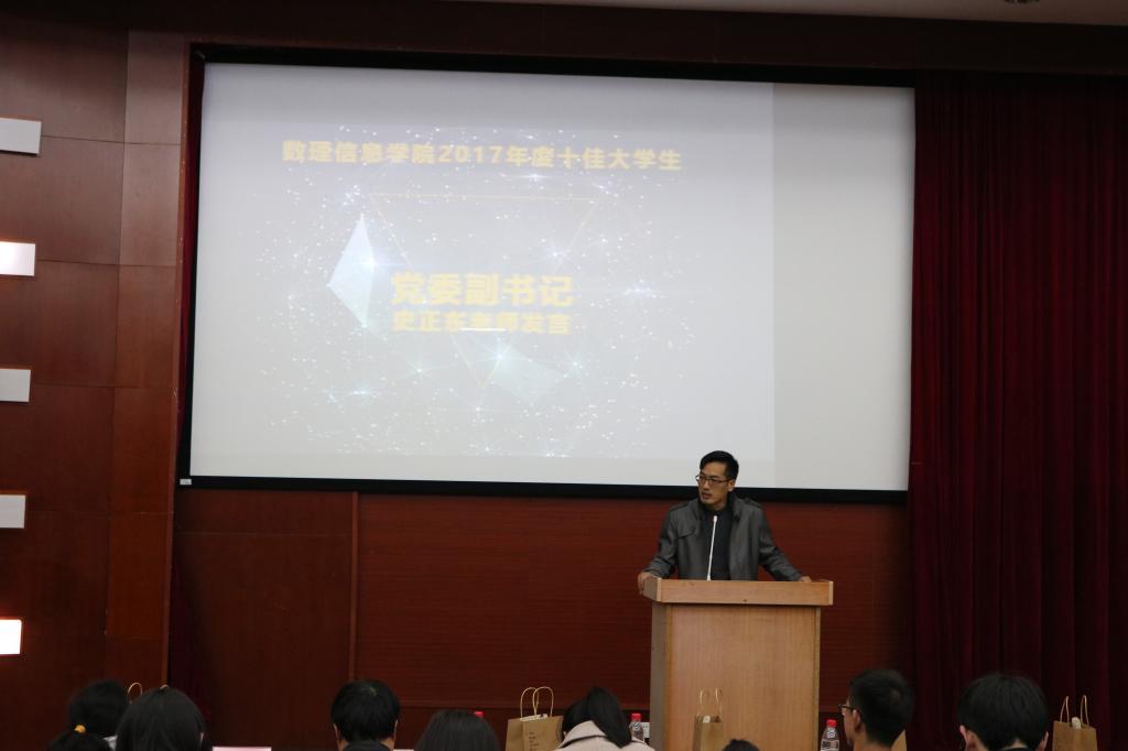 党委副书记史正东老师为他们一一颁奖祝贺并对此次活动进行了精彩点评。他首先鼓励和表扬了参与此次活动的所有候选人以及工作人员的辛勤付出。其次他对于各位候选人的台风进行了点评。他指出,我们同学的台风很稳,能够很自然的表现自己的优势,比如物理161班的童一诺同学、数学141班的丁丹琦同学等。史书记指出,将来逼喱逼喱