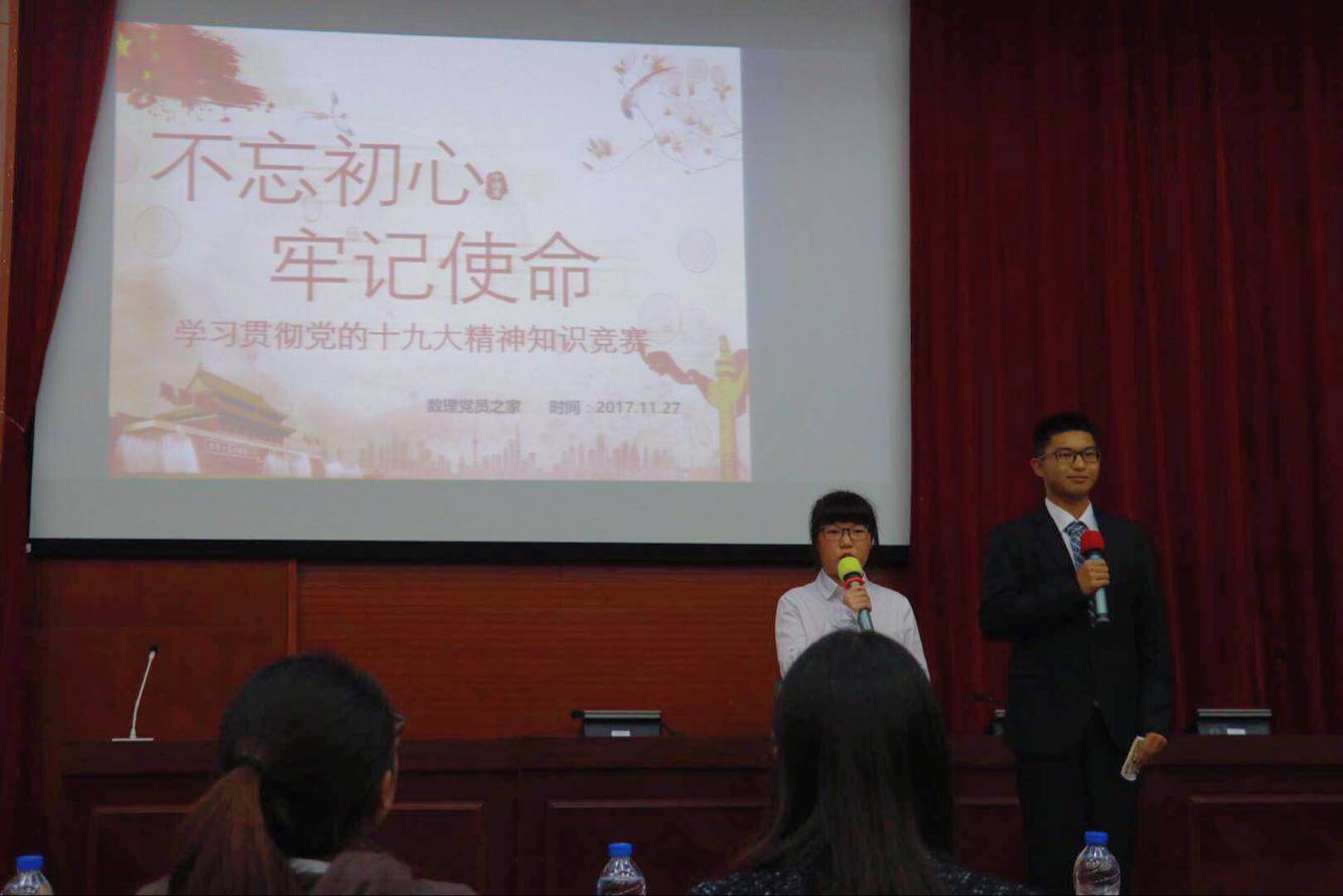 便采用现场知识竞赛和网络知识竞赛两种形式,组织举办了“不忘初心牢记使命”学习贯彻党的十九大精神知识竞赛活动,全院师生党员、入党积极分子、入党申请人等热情参与。现场知识竞赛分笔试初赛、“九宫格”复赛、对抗决赛三个阶段开展。经过激烈的角逐,最终6支队伍进入决赛现场。决赛设置风采展示、两两对抗、三足鼎立等环节,设有必答题、抢答题、判断题、填空题、视频题等。各支队伍沉着冷静,竞争激烈,比赛间隙还开展了红歌竞猜活动,气氛热烈。以十九大知识竞赛活动为突破口,逼喱逼喱