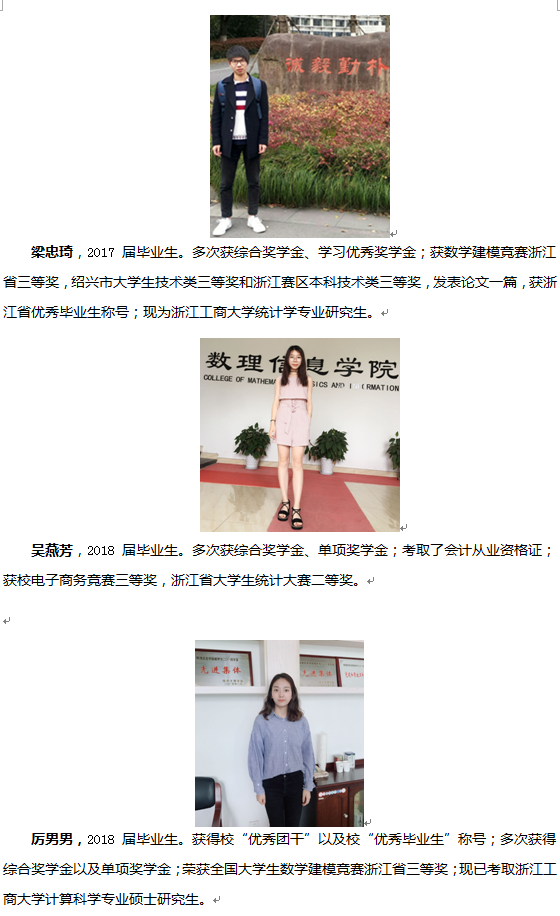 近年来,本专业教师在指导学生参加学科竞赛方面,取得了丰硕的成果。全国大学生数学建模竞赛中共获得省级及以上奖项100多项,其中国家级10多项。浙江省大学生统计调查大赛中共获得省级奖项40多项,其中省一等奖6项。特别是在2017年省统计调查大赛中,我校共获得省一、二、三等奖各1项、8项、1项,成绩位于全省高校前列。电子商务竞赛共获得省级及以上奖项15项,其中国家级1项。