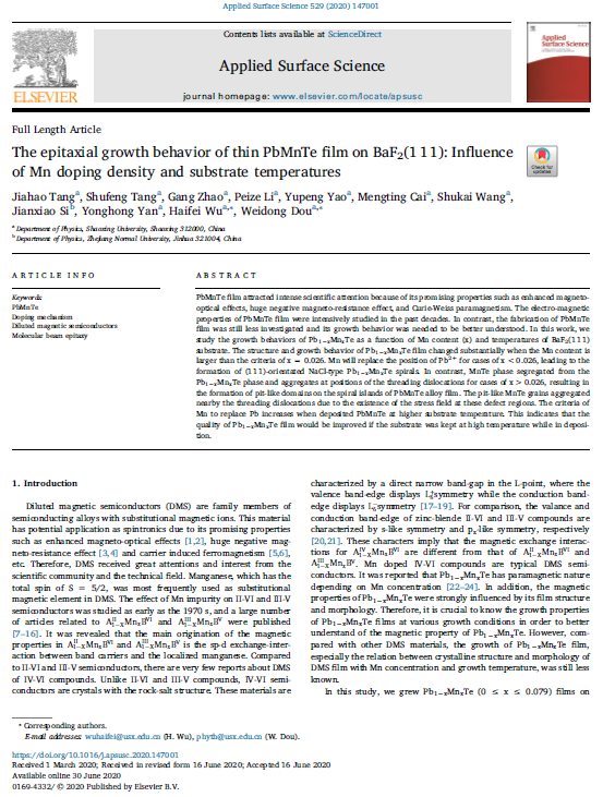微电子科学与工程161班唐家豪同学以第一作者在SCI 1区收录期刊《Applied Surface Science》发表学术论文《The epitaxial growth behavior of thin PbMnTe film on BaF2(1 1 1): Influence of Mn doping density and substrate temperatures》,该杂志影响因子为6.182。本文阐述了Mn掺杂对PbTe薄膜形貌和结构的影响机理,是逼喱逼喱