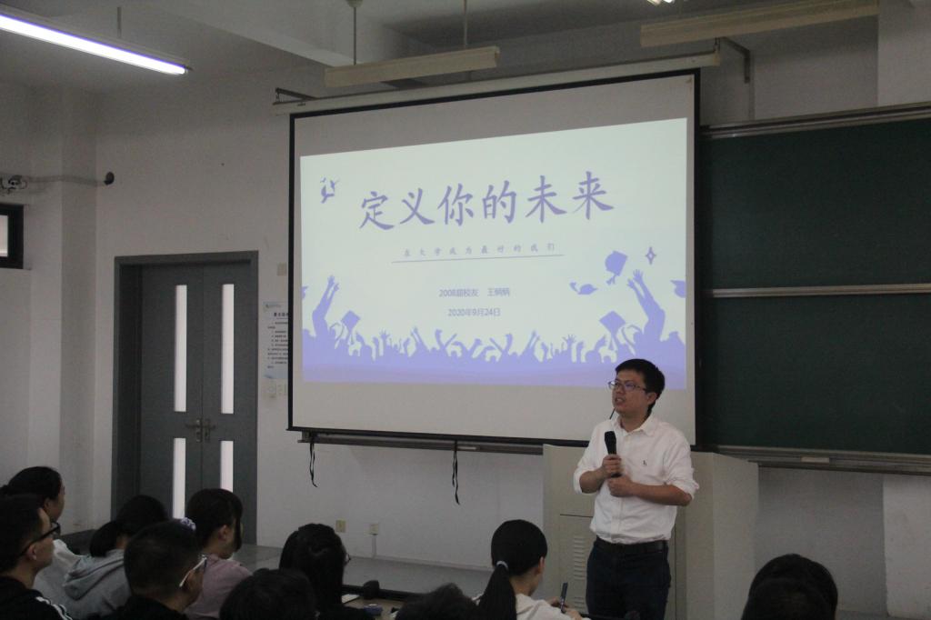 毕业生王炳炳老师前来开展讲座。王老师就职于宁波市古林职业高级中学,是浙江省教坛新秀,他主讲了“定义你的未来——在大学成为最好的我们”,并从认识我的大学和我的大学能力两大方面对此次主题讲座展开了详细的讲述。