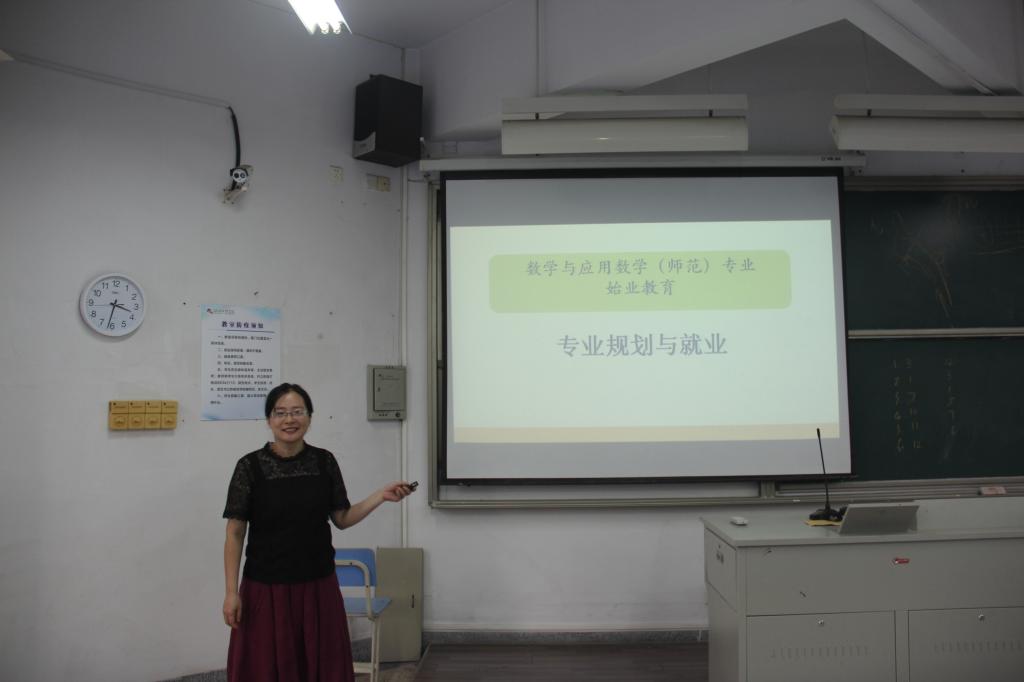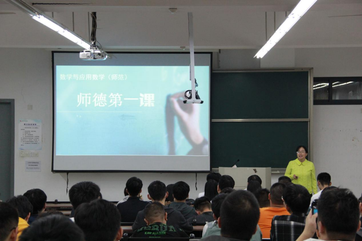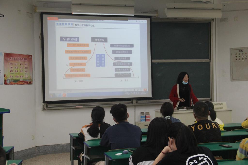 各专业进行了更加具有针对性、更为深入的专业思想教育,如数学与应用数学(师范)专业开展了思想教育讲座——师德第一课,魏雪蕊老师强调了师德的重要性并对当前师德缺失的现象进行了分析,还向大家讲授了师范生的道德养成,勉励大家热爱专业,笃定未来的教师职业,坚定师范生“爱教乐教、好为人师”的职业观念,向成为未来的人民教师目标不断努力前进,形成乐观、开朗的心态和富有耐心、爱心的职业性格,修德求真,不断践履。