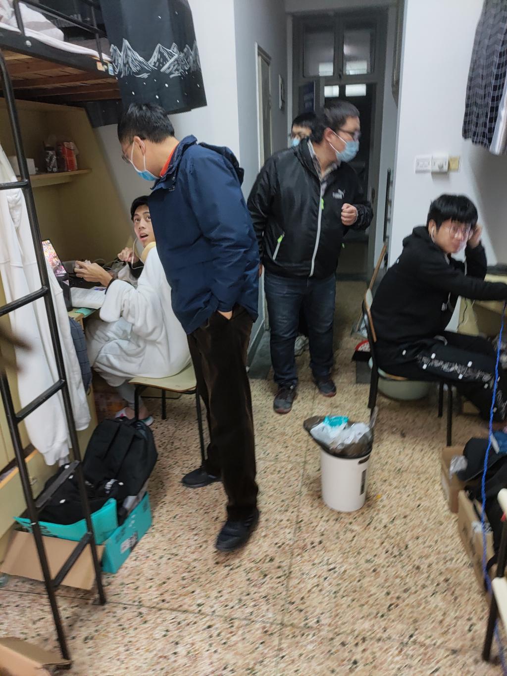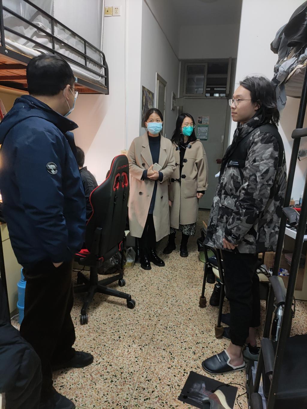 学生科、教研科、办公室等相关老师到寝室里检查同学们上网课质量,记录课堂状况。