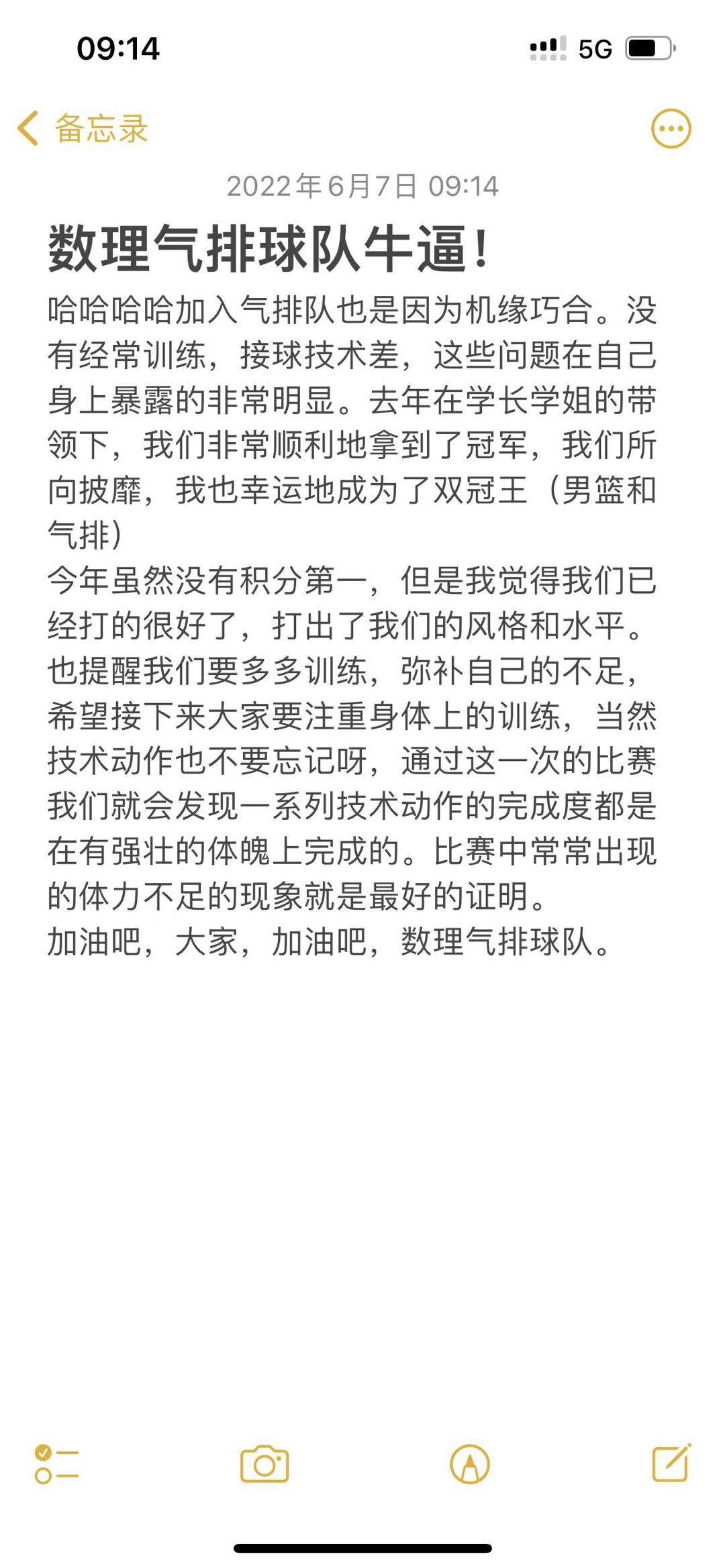 刚进气排球队的时候啥也不会还去风雨打,一个球也接不到,我都快被自己蠢哭了,但是你们还是经常鼓励我去,很耐心的教了一遍又一遍,真的让我很感动!虽然在队里待了很久,但是也没什么进步,没什么贡献,感觉挺愧对你们的教导