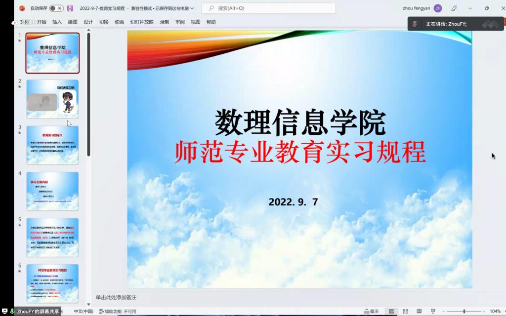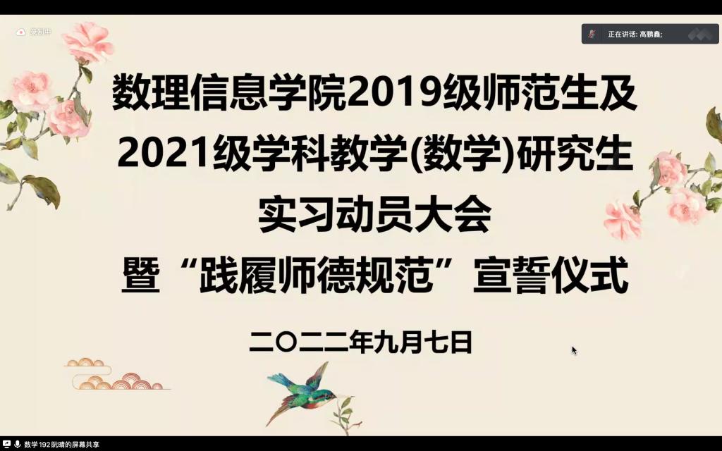 副院长黄玲娣、数学系教工党支部书记周凤燕、实习指导教师和2019级数学与应用数学(师范)专业师范生、科学教育专业师范生和2021级学科教学(数学)研究生。大会由数学与应用数学(师范)193班高鹏鑫同学主持。