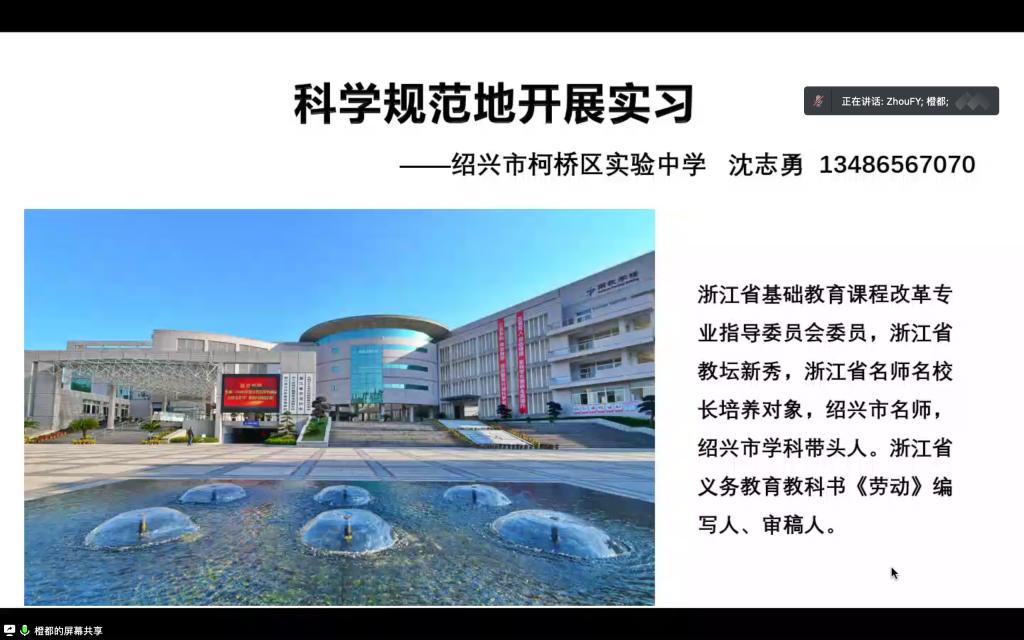 绍兴市柯桥实验中学副校长沈志勇老师做专题报告。沈校长系统全面地阐述了如何科学规范地开展实习。首先,沈校长建议各位师范生在科学规范地开展实习的同时,还要博采众长、团队合作、独立自主,并注重进行科学实验。沈校长借助不同教师的课堂板书设计生动形象地讲解了如何观察课堂并从中发现问题,要从听中学,做中学,在实现内化的同时要外显出来,实现明言知识和默会知识间的不断转化,从而有效提升实践智慧。接下来,沈校长分析了教学改进的过程方法,从中要强化研味、凸显过程、明确方向,做好问题研究设计,再进行实践研究从而改进教学策略,并通过学科个性化学习与教学流程的三种研究加以佐证,强调了研究实践的重要性。并且沈校长说明了学情分析是促进精准化教学的关键,学情调研不止于课堂的显性观察,还有对作业、课外辅导等课堂主阵地外的隐形观察,要借助多种学情调研方法,才能实现从原本的“错题——干预”到“把握认知规律——精准设计——提前干预”的教学设计流程转换,实现问题解决;同时可借助有效工具,对课堂观察数据进行收集并提炼,实现教研改进。最后,沈校长希望各位师范生在实习过程中,能够用科学规范的研究方法进行观察、研究、评价、评估,工具性地看书,学术性地反思,从中发现问题,解决问题,并通过行动学习理论强调了练习实践和沟通交流的重要性。