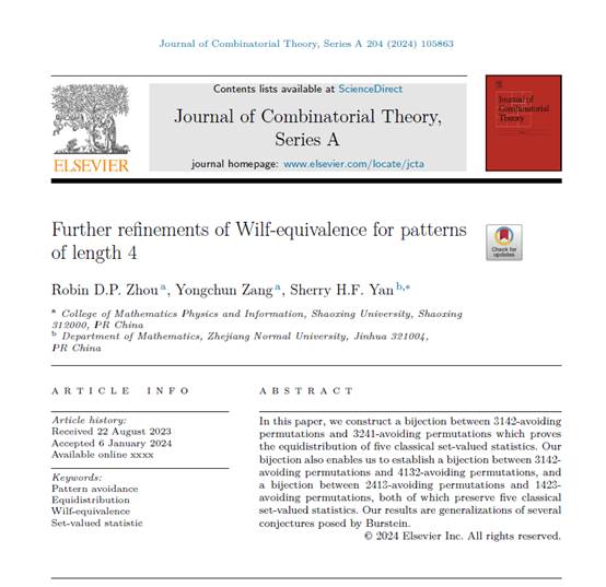 周大跑博士与学生藏永纯,浙江师范大学严慧芳教授在模式避免方面取得了新进展,相关结果以题为“Further refinements of Wilf-equivalence for patterns of length 4”发表在组合数学期刊Journal of Combinatorial Theory, Series A(JCTA)上。JCTA是组合数学公认的顶级期刊,主要发表组合数学领域具有重要理论意义和应用价值的高水平研究论文。该期刊以选稿严格著称,2023年全年仅刊发69篇研究论文。