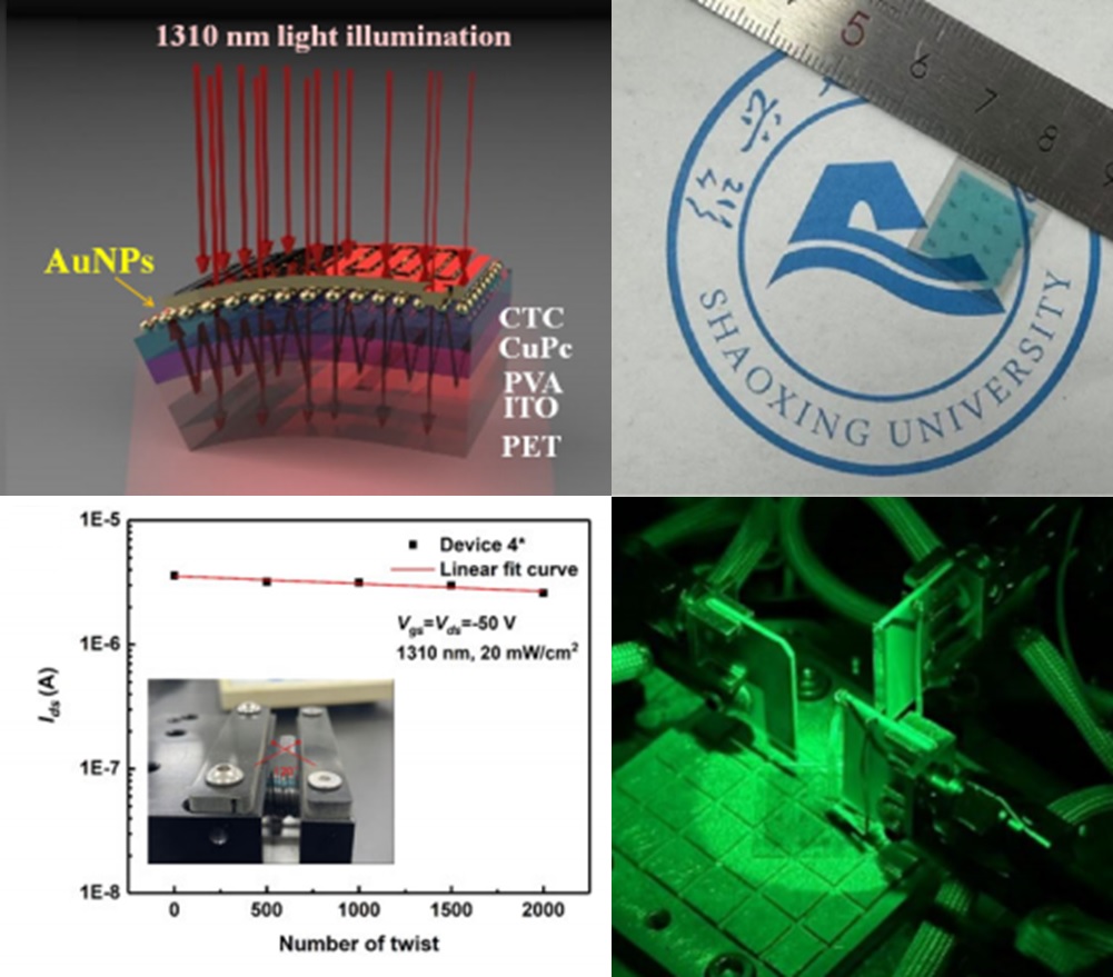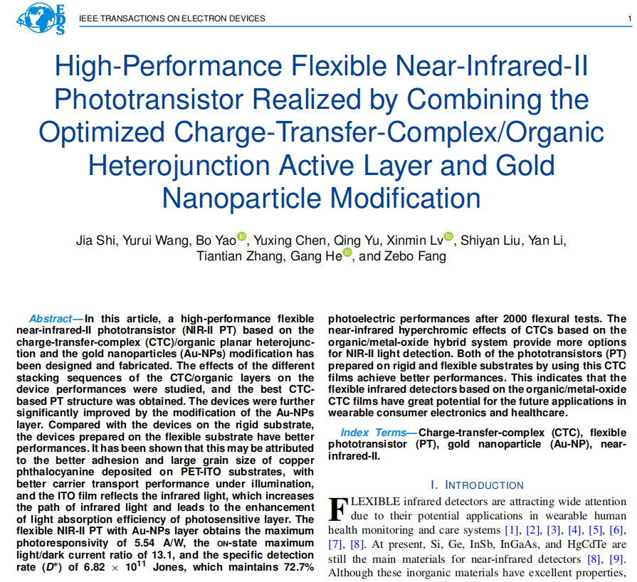 集成电路器件物理与工程专业研究生石佳、王宇睿以共同一作在《IEEE TRANSACTIONS ON ELECTRON DEVICES》上发表题为《High-Performance Flexible Near-Infrared-II Phototransistor Realized by Combining the Optimized Charge-Transfer-Complex/Organic Heterojunction Active Layer and Gold Nanoparticle Modification》(DOI: 10.1109/TED.2024.3384347)的研究论文。该论文阐述了一种新型柔性非制冷半导体红外探测器的构筑策略。器件采用柔性PET衬底,利用电荷转移复合物/有机半导体异质结作为探测器活性层,并利用金纳米颗粒的增强优化,实现对NIR-II区(1000-1700 nm)的高效光探测。NIR-II区是光纤通信和生物荧光成像技术的重要窗口,该成果将有助于柔性红外传感器的设计,在可穿戴设备和生物医疗中有潜在应用。
