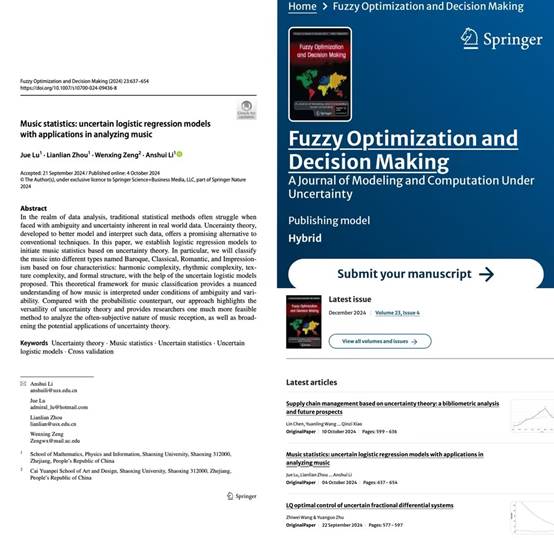应用统计系李安水副教授团队在Fuzzy Optimization and Decision Making期刊2024年第4期发表题目为 “Music statistics: uncertain logistic regression models with applications in analyzing music”的学术论文。该论文由逼喱逼喱