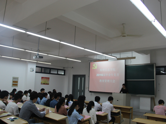 2016届毕业生党员大会在南山综合楼A108举行。2016届全体毕业生党员参加会议。院党委书记楼智美教授应邀出席活动并上专题党课。大会由院专职组织员叶芳芳老师主持。