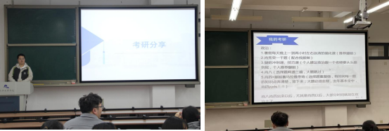 分享会开始,魏老师首先展示了往届数学专业学生考研考取的院校,接着具体介绍了可考的专业和考研所需的考试科目,并针对备考过程提出了一些复习的建议,并劝告同学们不要扎堆报考,要结合自身的情况去选择院校。