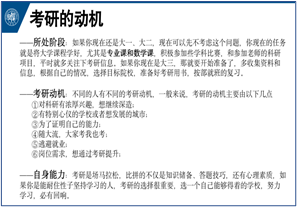 讲座期间,刘晓辉学长结合自身考研经历和读研期间的感受分享了备考前期的建议、考试复习计划、考研过程经验,让同学们收获颇多。第一:在考研前期准备中,大家需要明确自己的考研动机,关注近几年的考研人数,结合自身能力确定好目标院校及目标专业,充分利用目标院校的资料书进行复习,将事半功倍;第二:在初试准备中,同学们需要将时间规划好,具体而言分三个阶段——基础阶段、强化阶段及冲刺阶段。基础阶段注重数学一轮复习及英语背单词,强化阶段注重强化数学、政治及专业课复习,冲刺阶段注重背政治分析题及英语作文。刘晓辉学长还专门为每一科推荐了相应的资料书,强调要解决问题,重点在于刷题,写错题集并及时总结方法。学长还给出一张完整的暑期复习安排表,希望能够给考研学生提供参考。关于复试准备,学长分笔试、面试及联系导师三阶段讲解,并强调慎重选择导师极为重要,合适的导师对于你的研究生生涯起着举足轻重的作用。
