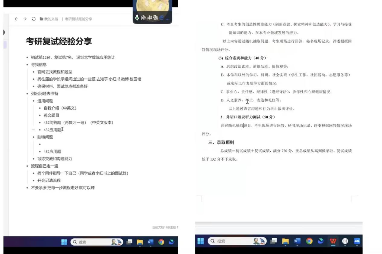 首先是原统计181班、现就读于深圳大学数学与统计学专业的麻淑蕾学姐,她推荐同学们从报考学校的官网上去了解往届的复试信息,并且有不懂的问题要积极和老师交流。除此之外也可从小红书,知乎等软件去了解考试信息与题目,来进行复试的备考。最后她提出建议:同学们可以提前进行面试场景模拟,例如自己与同学进行模拟,达到增加面试的熟练度的目的。