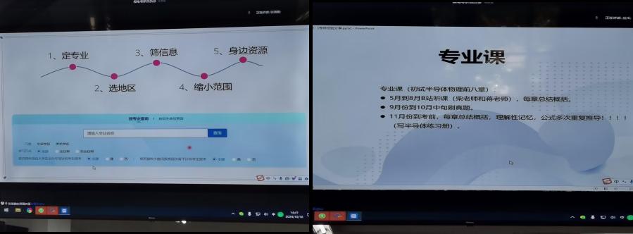 首先是考研经验分享环节。已考取华东师范大学集成电路科学工程,原微电201班杨文锦学长结合自身考研经验从初试和复试两大方面进行阐述。在讲到学科复习时,学长针对各科目分享了亲身经历与个人心得,尤其强调刷题不应盲目,刷近几年的真题更有意义。最后学长还强调了学好英语的必要,建议大家提前开始背诵单词,有助于阅读专业相关的文献并为考研英语打下优良基础;接下来是已考取中国计量大学光电工程,原微电(专升本)221张萧鹏学长进行分享,他从个人情况、院校选择、备考经验三大方面为大家提供了宝贵经验。院校选择方面,学长建议使用研招网来查找感兴趣的学校,合理利用周边资源来选择;备考经验方面,他提供了复习书目、考研范围、复习时间线、良师课程等复习经验。最后,学长强调了数学与专业课的重要性。分享会的最后,两位学长表示考研重在坚持,脚踏实地。