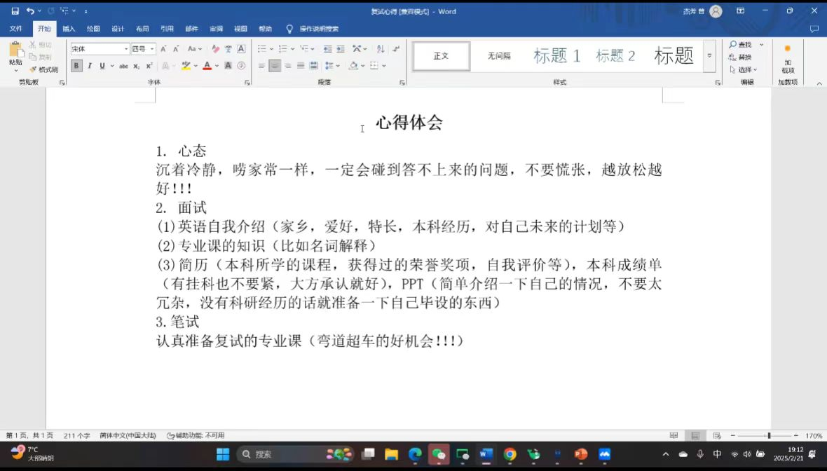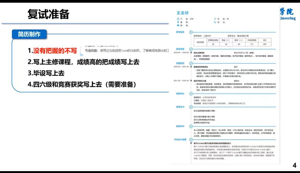 接下来,原微电201班,现就读于浙江农林大学光学工程的王志轩学长详细介绍了关于复试简历的制作和面试环节需要注意的事项,列举了几个象征性的问题供参考,很有借鉴意义。最后讲到调剂准备,鼓励大家遇到调试的情况不要放弃。