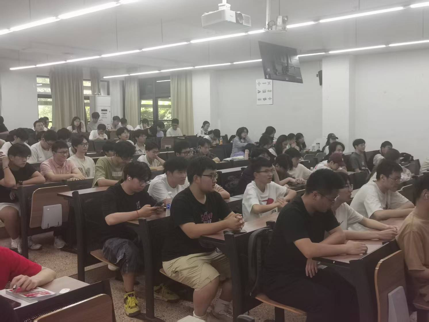 物理系主任董一鸣老师、已考研上岸的两位同学出席本次分享会,电信和光电专业学生全体参与,分享会旨在向光电与电信专业的学子们介绍专业发展方向。