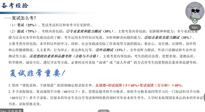 在初试方面,严学长系统阐述了数学类考研的考试科目,他强调了公共课和专业课的复习策略各有侧重,需要根据自身报考专业合理安排,此外还分享了如何利用互联网资源,如专业课真题和考研经验帖,来辅助学习。在复试环节,复试形式多样,包括笔试和面试。其中,面试又分为专业素质和能力测试、综合素质及能力测试、外语测试和思想政治素质和品德考核等。他还特别提醒,联系导师宜早不宜迟,复试成绩公布之后,尽早联系。