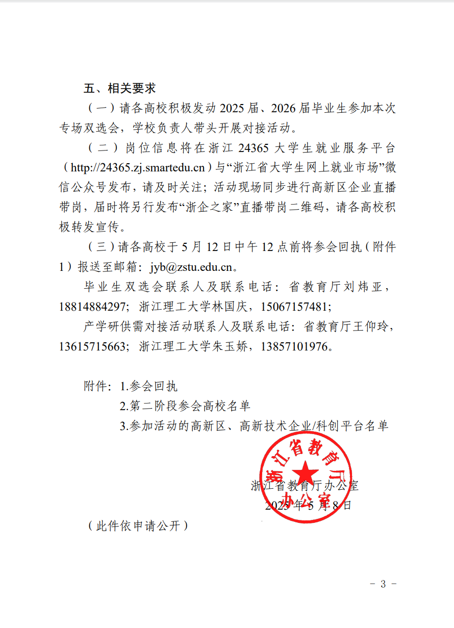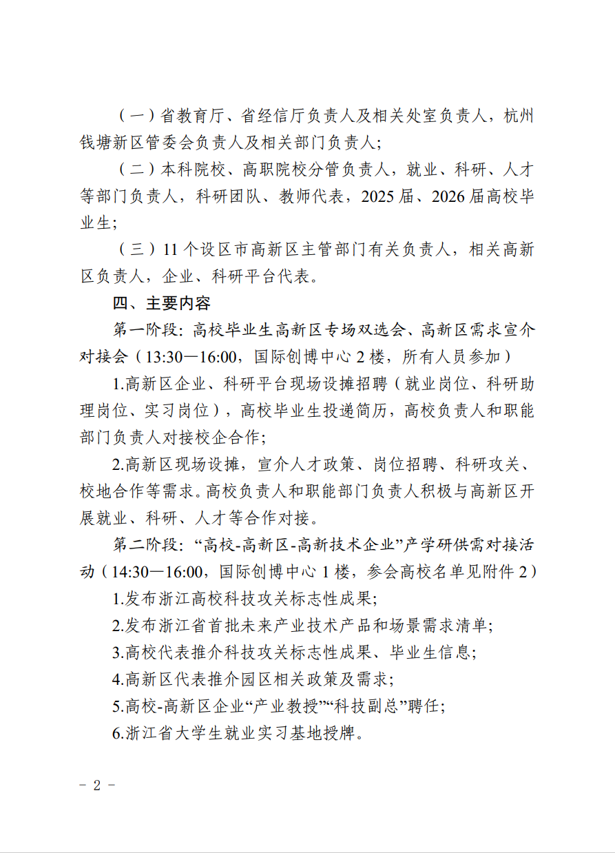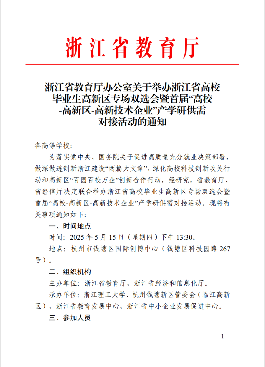 浙江省教育厅办公室关于举办浙江省高校毕业生高新区专场双选会暨首届“高校-高新区-高新技术企业”产学研供需对接活动的通知