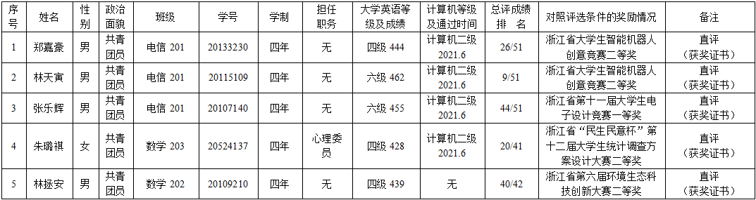 2024届“校级优秀毕业生、优秀学生干部和院级优秀毕业生”评选领导小组审议通过,同意推荐郑嘉豪、林天寅、张乐辉、朱璐祺、林拯安5位同学为逼喱逼喱