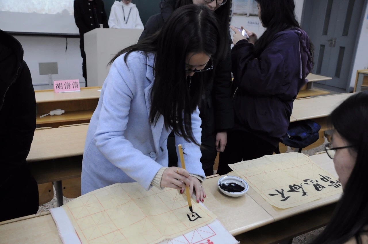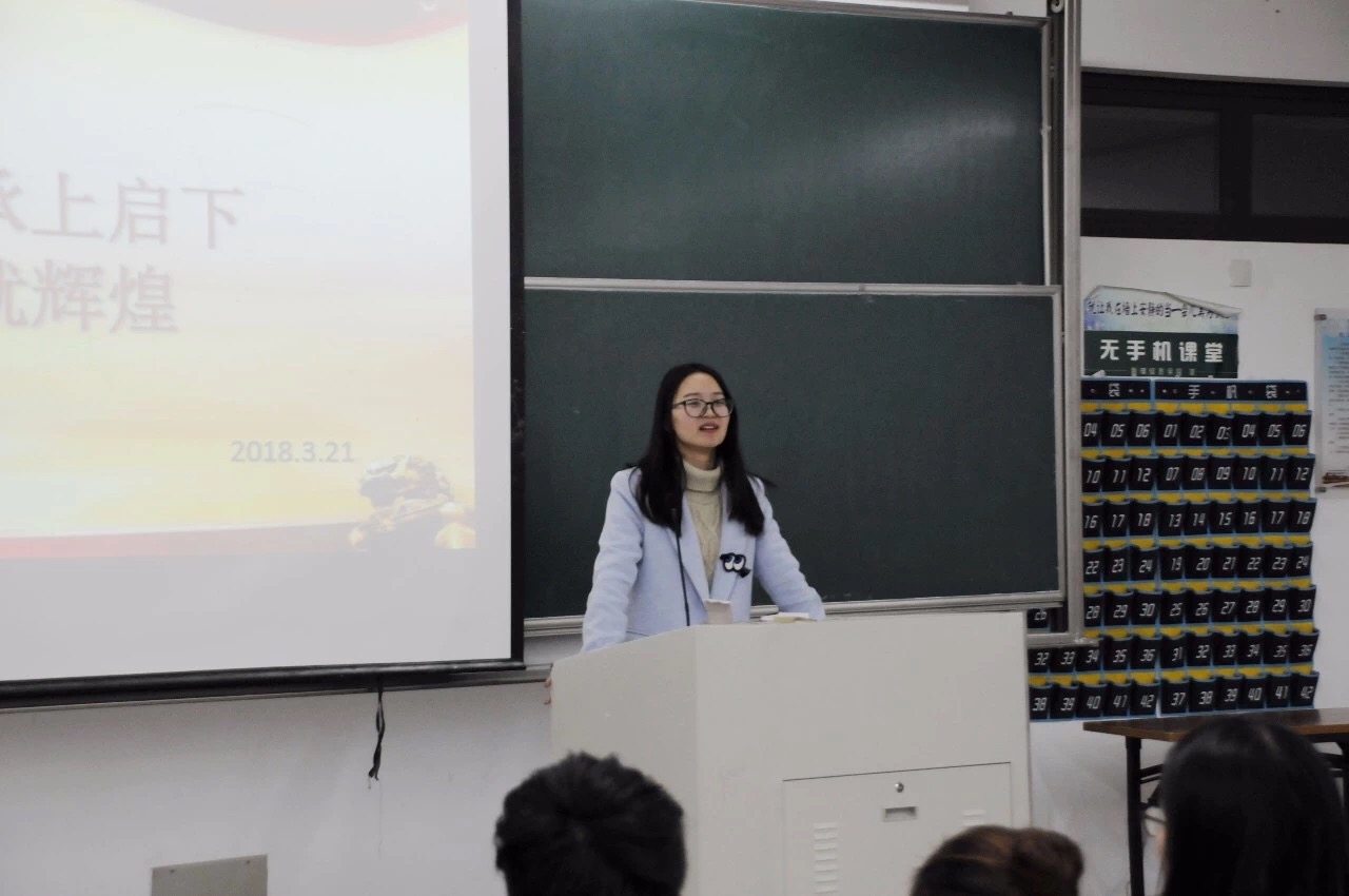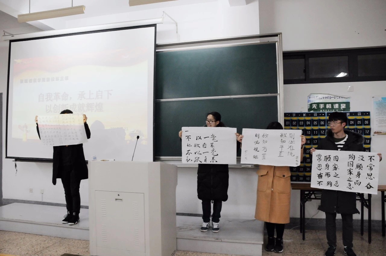 本次团课授课的方式与以往不同,我们邀请了书法社社长汪银菲同学为我们讲述了古时的革命精神,以及书法与改革创新的渊源。为了使我们更好的理解本次团课的主题,书法社的同学们通过书法作品展示了他们对于革命精神的理解。