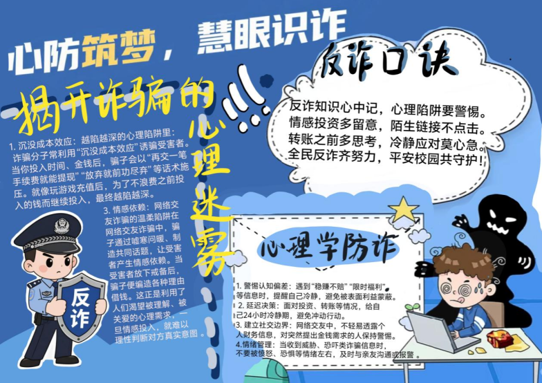 为引导同学们从心理学视角剖析诈骗陷阱,提高理性思维和情绪管理能力,我们举办了“心防筑梦,慧眼识诈”手抄报创意征集活动。活动期间,我们收到了来自22-24级同学们的众多优秀作品。这些作品紧扣反诈主题,结合认知偏差、社会心理学原理等知识,对各类诈骗案例进行了深入浅出的分析。
