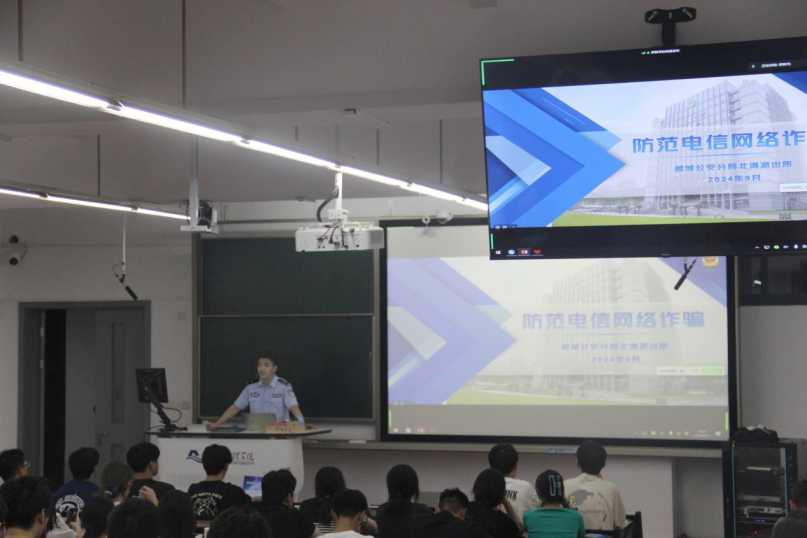 警官首先向同学们介绍了什么是“电信网络诈骗”,通过有趣的反诈视频并结合真实案例向同学们介绍了多种反诈手段。随后,他结合反诈法,向同学们提出了八个“凡是”的防范对策,下载国家反诈中心APP以及关注与反诈相关的公众号视频号等。最后,他也对同学们的校园安全防范工作作了重要提醒。